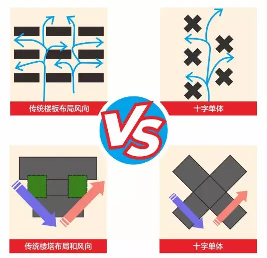 碧桂园多年来始终坚持以用户为中心,潜心研究后决定,采用纯点式布局建设未来城,对比与传统楼栋布局,十字单体楼栋建设。
