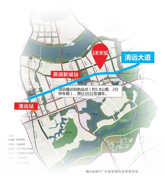 距离规划建设的广清轻轨燕湖新城站1.8KM