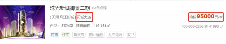 我们以广州花城大道为例,广州最有名的豪宅区域如汇悦台、博雅首府等,皆位于花城大道周围区域。十年伴随花城大道的发展,升值幅度超过500%,未来前景十分可观。就连现在在售的房子也位居广州房价前列,连公寓均价都高达9万5千元/㎡,更不用说洋房的价格。
