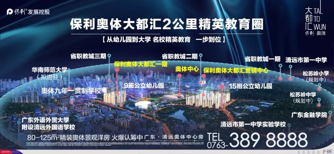 保利奥体大都汇社区内自建9班以及15班的2所公立幼儿园、奥体九年一贯制学校近在咫尺,周边2公里还被广外语外贸大学清远外国语学校、清远市排名前列中学、清远排名前列实验中学等精英教育院校环绕。