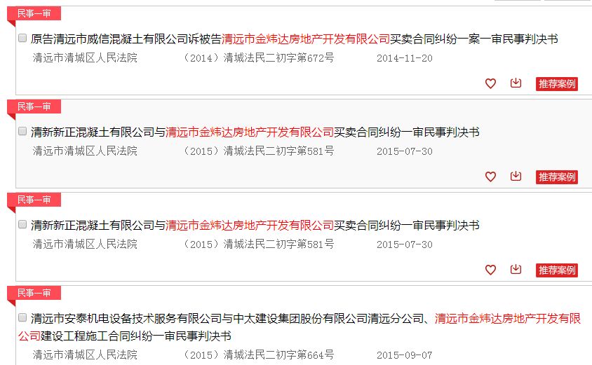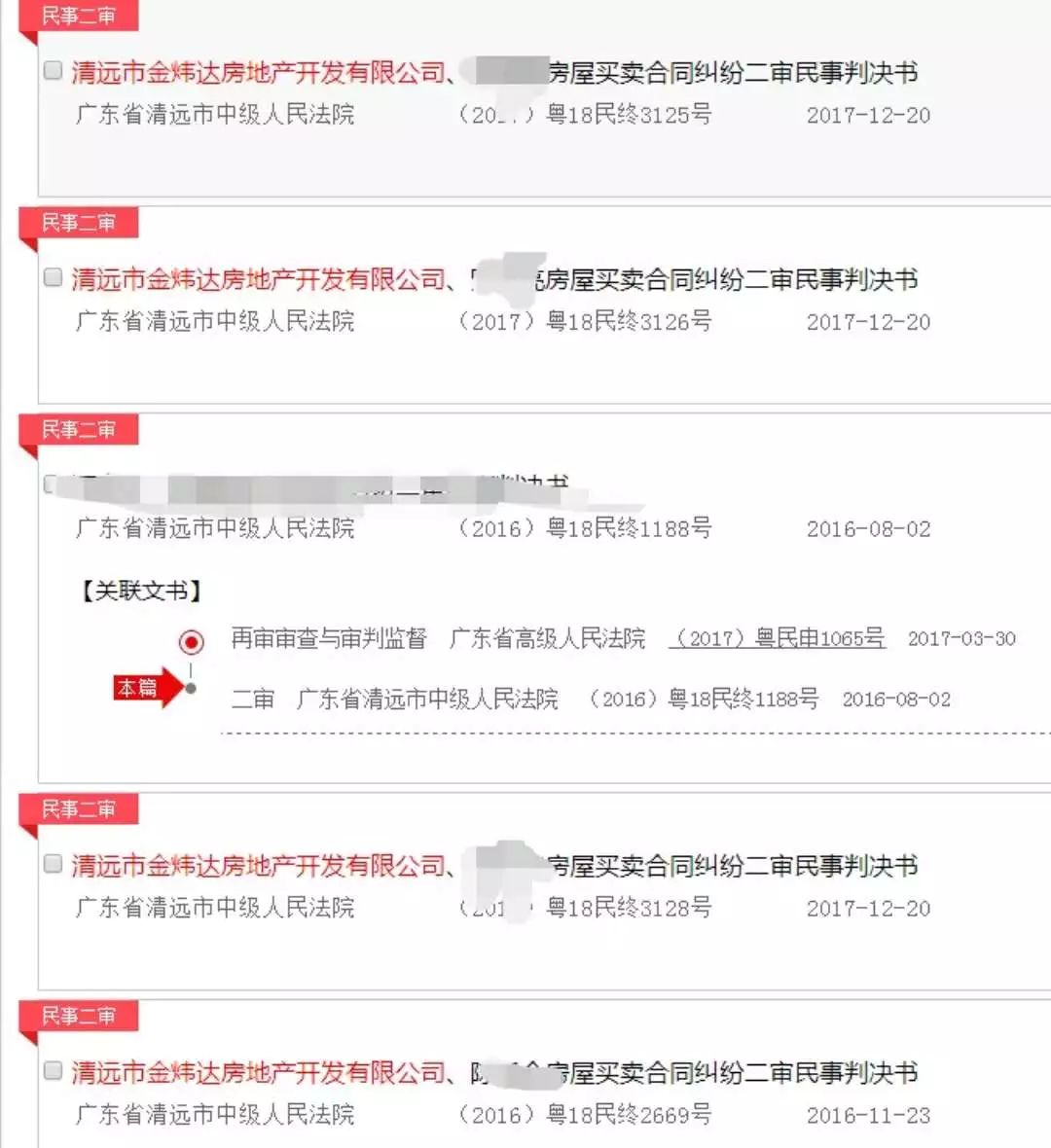 此外,这些判决书还透露:去年4月、5月,清远市住建局对有关金炜达公司的投诉来信作出答复,答复主要内容为因龙汇领峰1、2栋土地手续尚未理顺,导致项目1、2、3、4栋规划验收工作停滞,未能进行房屋竣工验收备案,主要原因是办理土地过户的问题;由于金炜达公司与承建商发生纠纷,造成该小区1、2、3、4栋未能及时办理房屋竣工验收手续,为保障购房人的合法权益,住建局暂停了该项目网签业务,督促开发商尽快整改。