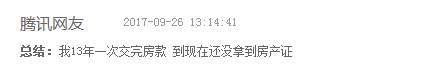 同样在腾讯房产网站上,有网友留言称,2013年就一次性交清放款,但直到留言之时(2017年9月)仍未拿到房产证。