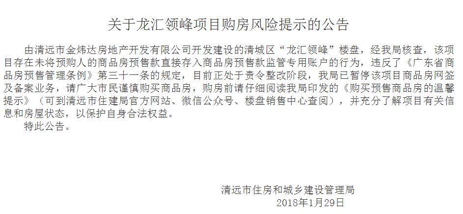 这个被“提示”的楼盘就是位于清远市区北江一路的“龙汇领峰”。根据公告,该楼盘因未将商品房预售款直接存入政府监管的专用账户,被住建局暂停商品房网签及备案业务。
